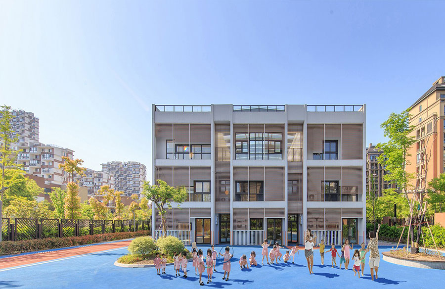 该幼儿园是杭州东部余杭新区的一部分。这座三层的新建筑,180幼儿园,计划分为6个小组,180名儿童,根据他们的年龄而定。每一组都有一个独立的集群,包括自己的卧室、更衣室/浴室和游戏室。